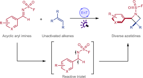 Azetidines are four-membered saturated N-heterocycles that are of interest in drug discovery and medicinal chemistry. Here the authors report how sulfamoyl fluoride substituents tune the reactivity of acyclic imine-derived triplet intermediates for the synthesis of azetidines via a [2 + 2] photocycloaddition reaction with alkenes.
