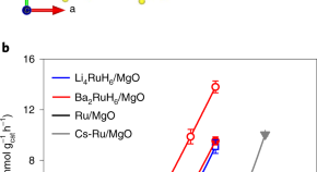 A new class of catalysts based on ternary ruthenium complex hydrides are developed for low-temperature ammonia synthesis. They support a non-dissociative reaction path for dinitrogen reduction, in which lithium or barium cations stabilize the NxHy intermediates and the electron- and H-rich [RuH6]4– anionic centres facilitate an energetically balanced multi-step reaction for ammonia synthesis.