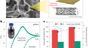 A structurally robust nanoporous carbon adsorbent that integrates a molecular-selective skin and an internal gas reservoir enables the adsorptive separation of propylene and propane. The surface sieving skin endows the adsorbent with competitive selectivity and the internal reservoir leads to a high propylene capacity, together facilitating the production of high-purity propylene.