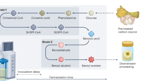 Benzyl acetate is a valuable aromatic ester compound used in flavorings and fragrances. Now, a microbial approach is developed to produce benzyl acetate from d-glucose using metabolically engineered Escherichia coli strains and exploiting delayed co-culture strategies.