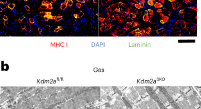 Genetic deletion of Kdm2a or pharmacological blockade of KDM2A, a histone 3 demethylase, in skeletal muscle shifts fuel preference from glucose to lipids under cold challenge in mice fed a high-fat diet. KDM2A loss increases the proportion of mitochondria-rich, slow-twitch myofibres, conferring flexible protection against metabolic stress.