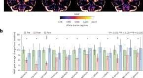 We observed that an MRI surrogate of myelin content, myelin water fraction, is reduced in white matter regions after marathon running but recovers later. These findings suggest that brain myelin content is reversibly reduced after prolonged exercise, consistent with evidence in rodents that myelin lipids provide energy under extreme metabolic conditions.