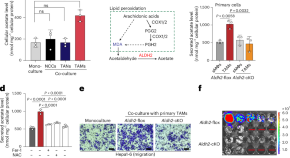 Cancer cells often increase their uptake of acetate for acetyl-coenzyme A biosynthesis, a mechanism that facilitates cancer metastasis. We found that, in hepatocellular carcinoma, cancer cells induce acetate secretion from tumour-associated macrophages, driven by a cell–cell metabolic interaction involving lactate, the lipid peroxidation–aldehyde dehydrogenase 2 pathway and acetate.