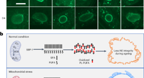 Reduced mitochondrial activity during development triggers a specific superoxide signal that downregulates the biosynthesis of unsaturated fatty acids. This metabolic shift limits lipid peroxidation, preserving nuclear envelope integrity and delaying ageing in Caenorhabditis elegans and in mammalian cells.