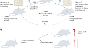 By analysing the effect of disrupting microbiota during in vivo reprogramming, Kovatcheva et al. demonstrated that vitamin B12-dependent metabolism is a limiting factor for cellular reprogramming and plasticity, and propose its therapeutic supplementation for the improvement of tissue repair.
