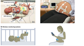 Skin-interfaced wireless biosensors offer great opportunities for inexpensive, burdenless and continuous health monitoring of perinatal and paediatric patients in clinical and home settings. This Review highlights the latest technology developments and deployment activity in this rapidly expanding field.