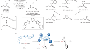 Chiral tetrahedral carbon atoms bearing functional groups amenable to functionalization offer numerous synthetic opportunities. Catalysed by copper pyridine-bis(oxazoline) complexes, the developed alkynylallylic substitution provides 3-substituted 1,4-enynes with excellent regio- and stereocontrol.