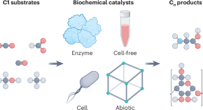One-carbon compounds, including carbon dioxide and methane, represent a sustainable resource for chemical conversions. This Review highlights recent advances in the biochemical upgrading of one-carbon substrates to value-added products using a combination of cellular, cell-free and abiotic catalysis strategies.