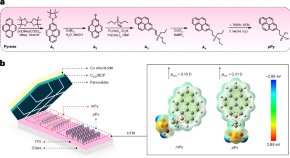 Charge-selective contacts have a key role in increasing the efficiency of perovskite solar cells (PSCs). A hole-transport material (HTM) is designed based on a symmetric aromatic molecule that facilitates long-range ordered π–π stacking on substrates. This HTM shows enhanced charge-transport properties, and when incorporated into PSCs, helps to deliver good efficiency and stability.