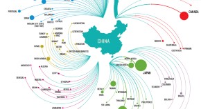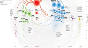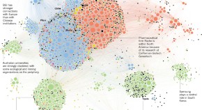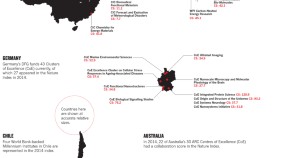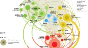 Shown here are all the countries in the Nature Index that collaborate internationally. They are sized by weighted collaboration score, which is the sum of the weighted fractional counts for each partnership the country has. The top 20 inter-regional collaborations are highlighted, with the thickness of the arrows scaled to show relative strength. Intra-regional partnerships are also coloured. Analysis by Larissa Kogleck