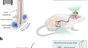We created miniature and flexible polymer fibers equipped with optoelectronic microdevices, microfluidics and electrodes that can be implanted in anatomically disparate organs such as the brain and the intestine. The microelectronic fibers can be operated wirelessly to sense and manipulate brain and gut neural circuits in untethered, behaving mice.