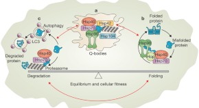 Cytoplasmic compartments containing misfolded proteins targeted for degradation, named Q-bodies, have been identified. Q-body formation is a dynamic process that actively manages the metastable state of the protein fold through small heat shock proteins and the Hsp70–Hsp90–Hsp110 proteostasis system to promote cellular fitness under both physiological and stress conditions.