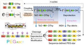 The creation of a viable technology that enables precise control over the monomer sequence in synthetic polymers remains a significant challenge. High-purity sequence-defined polyethers with readily tailored side-chain functionalities have now been made through liquid-phase iterative synthesis combined with size-exclusion molecular sieving and real-time monitoring.