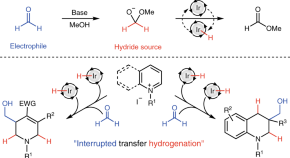 The concept of ‘interrupted transfer hydrogenation’ is presented, allowing the reductive hydroxymethylation of pyridinium and quinolinium salts at the C3 position. Mechanistic studies show the reaction occurs through an initial reversible iridium hydride reduction, followed by trapping of an enamine generated in situ before a final irreversible iridium-hydride reduction.