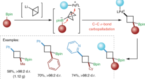 Widely used palladium-mediated cross-couplings typically operate via a handful of fundamental reaction steps. Now, the reactivity between palladium and C–C σ-bonds has been described. This carbopalladation enables the coupling of organoboronic esters and aryl triflates across a C–C σ-bond of a bicyclo[1.1.0]butane to form disastereomerically pure trisubstituted cyclobutanes.