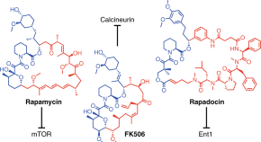 Rapamycin and FK506 are macrocycles that contain an FKBP-binding domain and an effector domain responsible for interacting with their respective targets, mTOR and calcineurin. Now, a 45,000-compound macrocycle library has been synthesized by fusing oligopeptides with synthetic FKBP-binding domains. Screening and subsequent optimization yielded a highly potent FKBP-dependent inhibitor of hENT1.