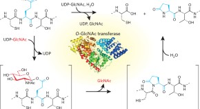 Proteolytic maturation of an important transcriptional regulator is performed by a glycosyltransferase. The reaction involves glycosylation of a glutamate residue and conversion of the γ-glycosyl ester product into an N-acyl pyroglutamate, which undergoes spontaneous hydrolysis to effect peptide backbone fission.