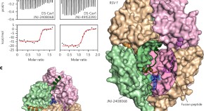 The binding of small-molecule inhibitors of the RSV F glycoprotein in a central cavity in the prefusion conformation stabilizes this conformation and blocks the conformational changes required for fusion with host membranes.