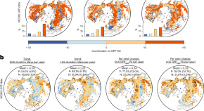 Terrestrial and marine photosynthetic production are typically studied separately. Now, an integrated analysis of land and ocean net primary production for 2003–2021 reveals that land and ocean net primary production show contrasting trends. Enhanced biospheric primary production is predominantly driven by an increase over land, partially offset by an oceanic decrease.
