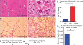 Sepsis patients often develop muscle atrophy that can last for years. Here the authors show in a mouse model that sepsis causes long-term impairment of the satellite cells, affecting mitochondrial function and energy metabolism, and that injection of mesenchymal stem cells restores satellite cell metabolism and muscle regeneration.
