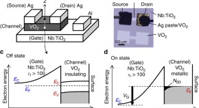 Oxide materials that undergo a metal to insulator transition under an applied electric field could extend the functionality of electronic devices. Here, the authors induce a phase transition in vanadium dioxide via a titanium dioxide gate, and thus modulate the current flowing through the channel.