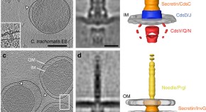 Bacterial type III secretion systems (T3SSs) inject virulence effector proteins into eukaryotic cells and are activated by host membrane contact. Here the authors report the in situ structure of the Chlamydia trachomatisT3SS in the presence or absence of host membrane, and observe compaction of the basal body embedded in the bacterial envelope.