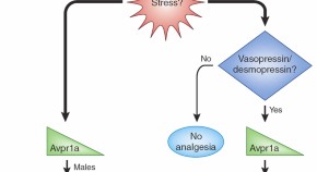 Variations in the arginine vasopressin receptor gene, AVPR1A, are shown to be associated with pain sensitivity in a stress- and sex-specific manner in both mice and men.