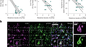 Early tactile deficits in patients with Alzheimer disease (AD) and AD mouse models map to tau pathology in spinal cholecystokinin (CCK) neurons. In AD mice, reducing tau or c-Maf levels in spinal CCK neurons restores touch and benefits cognition, suggesting that these deficits are a noninvasive peripheral indication of early AD and offer a tractable target for intervention.