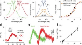 The authors generated a red, pH-sensitive fluorescent protein, pHTomato, which can be used to monitor neuronal activity alongside green reporters. When fused with the vesicular membrane protein synaptophysin, it can be used in parallel with the GFP-based GCaMP3 to image presynaptic transmitter release and Ca2+ transients simultaneously in the same neurons.