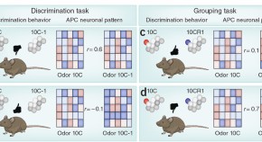 Learned odor discrimination and generalization are reflected in patterns of ensemble activity in anterior piriform cortex, where learned discrimination between two odors reduces the correlation between their induced patterns.
