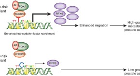 A new study shows that HOXB13 is preferentially recruited to the risk allele of a prostate cancer–associated SNP, enhancing the expression of RFX6, a driver of prostate cancer cell migration and predictor of disease progression. The work illustrates how a single risk locus contributes both to prostate cancer incidence and, through functional follow-up, to disease progression.
