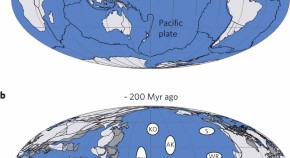 The plate tectonic configuration of the Triassic–Jurassic palaeo-Pacific Ocean is unresolved. Analyses of ancient geological rocks that are preserved at the margins of North American and Asian continents, combined with tomographic images of subducted slab remnants, indicate that subduction zones may have once existed in the centre of the palaeo-Pacific Ocean.