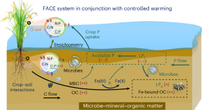 Long-term field experiments demonstrate that elevated CO2 and warming synergistically constrain phosphorus availability to plants by promoting its retention in iron–organic matter complexes and microbial biomass, thereby intensifying nutrient limitations that might threaten rice yields under future climate conditions.