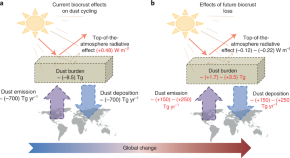 This study shows that by stabilizing the soil, biological soil crusts reduce global atmospheric dust emissions by 60%, corresponding to ~700 Tg of dust per year. According to models of biocrust cover loss, this effect will be reduced in the future, leading to increases in not only dust emissions but also global radiative cooling.