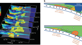 Water that has been carried deep into the Earth by oceanic plates in subduction zones, can influence earthquakes and volcanic eruptions. Three-dimensional images of electrical resistivity derived from electromagnetic geophysical data provide new constraints on the distribution, transport, and storage of water in the Cascadia subduction zone.