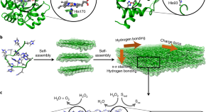 Self-assembling, histidine-rich peptides with similar catalytic functions as those of haem-dependent peroxidases are reported. These findings may have implications for the design of cofactor-free catalytic nanomaterials.