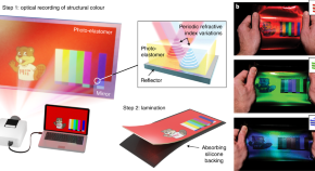 Desired for optical sensing or visual communications, structural colour-changing materials are hindered by the lack of scalable manufacturing. Here, by adapting Lippmann photography, large-area manufacturing of colour patterns in photosensitive elastomers is realized.