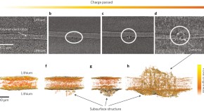 • Failure caused by dendrite growth in rechargeable batteries with lithium metal anodes has prevented their widespread applicability. A microtomography study on lithium–polymer–lithium cells now reveals that at the early stage of dendrite formation dendritic structures lie within the electrode, underneath the polymer/electrode interface.