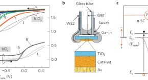 • Photoelectrochemical water-splitting devices require integrating electrocatalysts with light-absorbing semiconductors, but understanding charge-transfer processes at interfaces has proved difficult. Ion-permeable electrocatalysts deposited onto TiO2 photoelectrodes now result in adaptive semiconductor/electrocatalyst junctions where both the effective interface barrier height and the photovoltage output change depending on the oxidation state of the electrocatalyst.