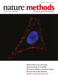 Quantum dots labeling of gangliosides (in red) in cellular membrane; nucleus appears in blue (Hoechst staining). protocol p73