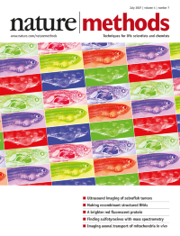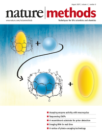 Artistic interpretation of mRNA visualization in living cells by Erin Boyle based on designs and images provided by Jeffrey Gerst, Natalia Broude and Yoshio Umezawa. Ribbon structures of the proteins were redrawn using Protein Data Bank (PDB) coordinates. Brief Communication p409, Articles p413 and p421.