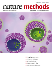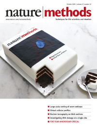This delicious version of Nature Methods' inaugural issue was baked by How Sweet It Is (http://www.howsweetitispastry.com/), New York. Labeling of gangliosides in cellular membrane and nucleus is in red and blue fondant, respectively. Photography by Christina Holmes. Special 5th anniversary issue feature starts on p701.