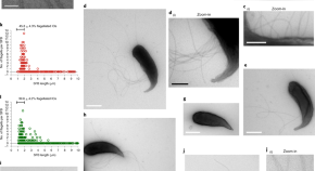 Electron micrographs show that mouse and rat segmented filamentous bacterium (SFB) unicellular intracellular offspring (IO) are flagellated and that flagellation occurs before IO release from SFB filaments.