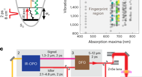 Two-photon excitation with mid- and near-infrared pulses encodes bond selectivity in fluorescence imaging. Single-molecule imaging and spectroscopy is demonstrated on individual fluorophores as well as various labelled biological targets.