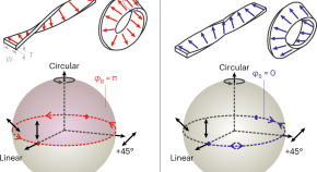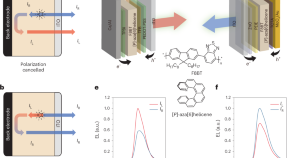 Circularly polarized light emitted from OLEDs exhibits opposite handedness depending on the propagation direction of the light. Switching the current flow in the OLED also switches the light handedness.