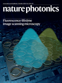 Fluorescence-lifetime image scanning microscopyIntegrating a single-photon avalanche detector (SPAD) array into a confocal laser scanning microscope yields a twofold increase in the localization accuracy for single-molecule localization microscopy. The cover shows an artistic impression of the SPAD array detector with microlenses, where the two disks/shaded Gaussians depict the emission of two different fluorescent molecules hitting the detector array.