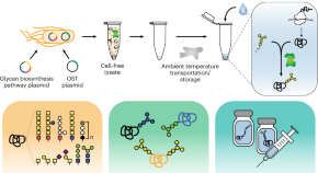 Here the authors describe a protocol for generating bacterial cell lysates and freeze-dried, cell-free reactions for on-demand synthesis of glycoprotein therapeutics and vaccines, as well as aglycosylated proteins (for example, conjugate vaccine carrier proteins).
