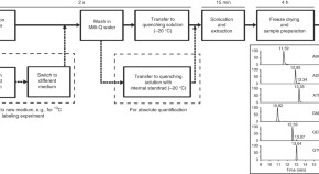 A challenge for metabolomics analysis is ensuring that sample preparation does not alter the cells' metabolic state. This protocol describes LC/MS analysis of core metabolites from adherent mammalian cells after rapid wash and quenching steps.