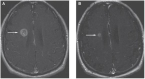 For patients with non-small-cell lung cancer (NSCLC) and brain metastasis, effective treatment strategies are required because systemic chemotherapy is usually ineffective. Pan and colleagues present the case of a 73-year-old man who was diagnosed with NSCLC with brain metastasis, who carried anEGFR mutation and was managed with erlotinib and whole-brain irradiation. The authors discuss the treatment options for patients with metastatic NSCLC and propose erlotinib as an appropriate therapy for patients with a high probability of harboring classic EGFRmutations.