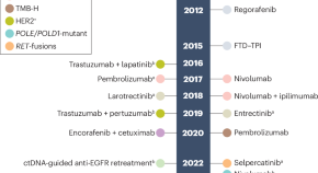 • Over the past few years, several novel therapies, including targeted therapies for specific subgroups as well as several non-targeted therapies, have been developed and approved for patients with chemorefractory metastatic colorectal cancer (CRC). Nonetheless, selecting patients who are most likely to benefit from one specific therapy is challenging owing to a lack of direct comparisons of the efficacy of these agents in specific settings. In this Review, the authors summarize the available evidence on the efficacy and safety of later-line therapies for patients with advanced-stage CRC and suggest an evidence-based treatment-selection algorithm.